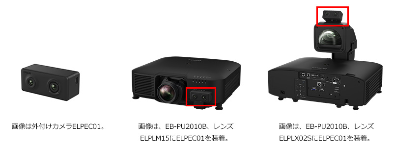EB-PU20/PU10シリーズはオプションの外付けカメラ(ELPEC01)を使⽤することでハイエンド機と同等の設置効率化を実現できます。外付けカメラは超短焦点ゼロオフセットレンズにも取り付け可能です。