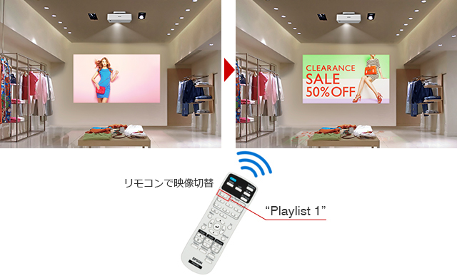 Epson Projector Content Managerで作成したコンテンツをプレイリストに登録すると、リモコンの数字ボタンで、簡単に投写映像の切り替えが行えます。