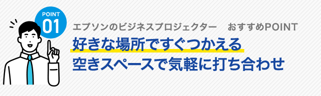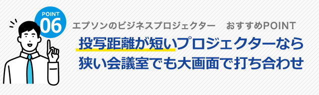 短焦点タイプのエプソンプロジェクターなら、会議室が狭く、壁との距離が短くても大画面で投写可能。情報共有がスムーズになり、打合せが効率的に進みます。