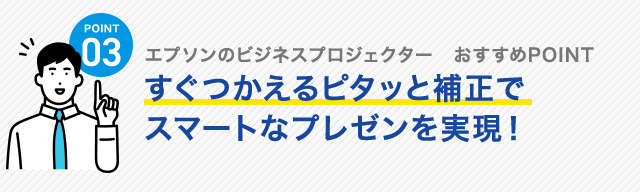 簡単に投写画面を補正できるビジネスプロジェクターを選べば、準備に手間取ることなくスムーズに本題に入れます。商談相手やチームメンバーを待たせることなく円滑にプレゼンや打ち合わせを進められます。