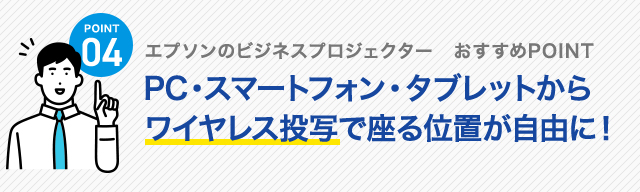 ワイヤレス対応のエプソンプロジェクターなら、スマホ・タブレット・PCなど、お好きな端末から自由に映像投写できます。また、ケーブルが不要だから座る位置が自由に。打ち合わせがフレキシブルになるので自由な発想につながります。