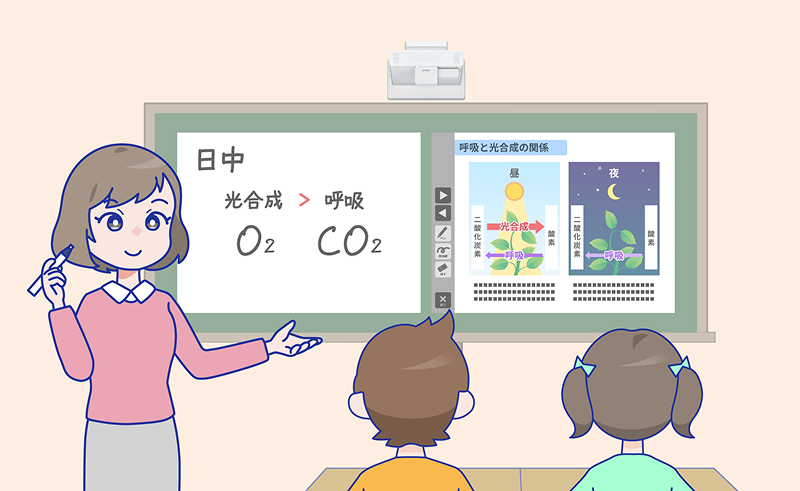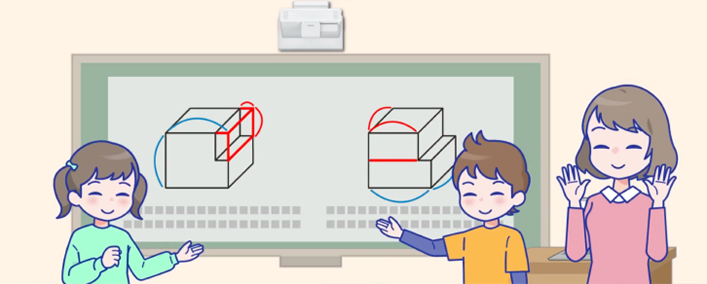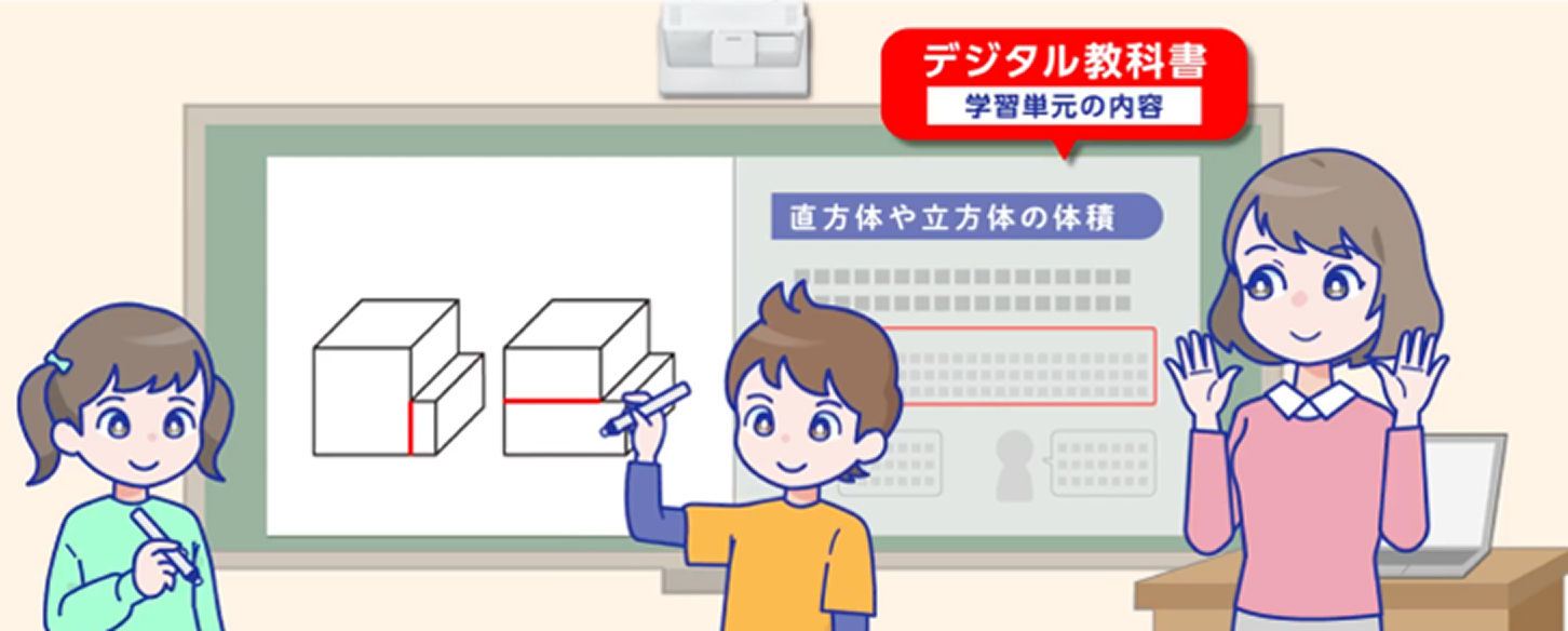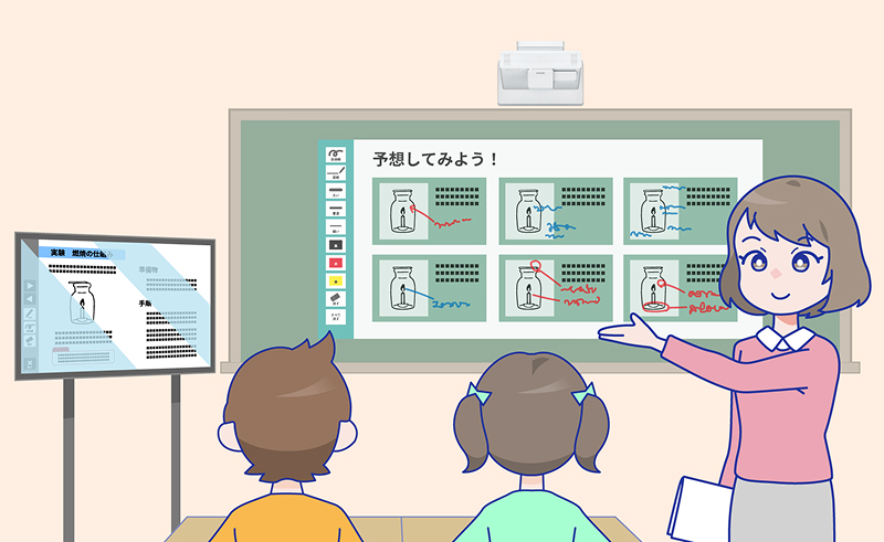 デジタル教科書などを投写しながら、児童生徒が前に出て板書することができ、主体的に授業参画できます。