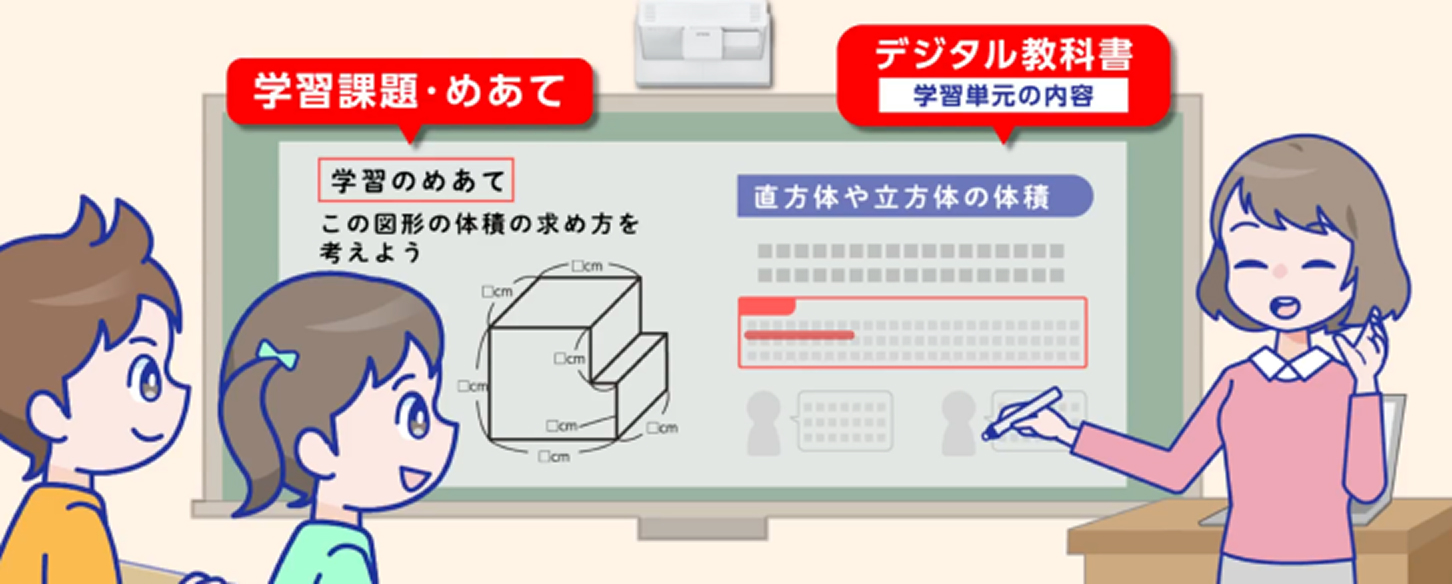 授業の学習課題・めあてを表示しながら、デジタル教科書などを投写できます。児童生徒は授業中いつでも振り返ることができ、授業の方向性を確認できます。