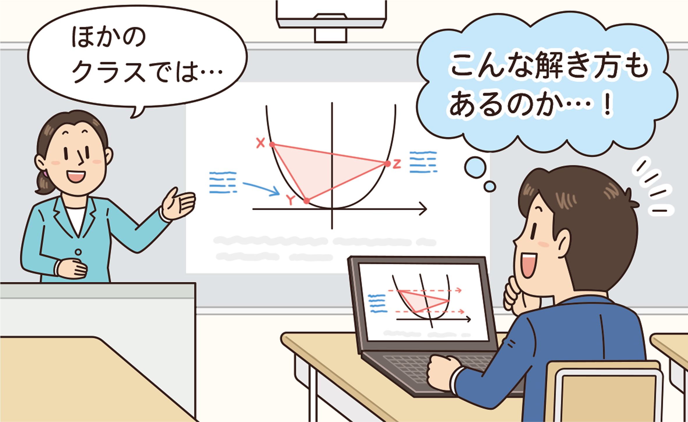 自分以外の生徒の考えや取り組みを参考にし、または共有することができるため、他者参照の授業を実現できます。