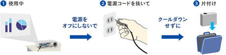 プロジェクター使用後、電源オフをすることなく、すぐに電源コードを抜くことができ、クールダウンもありませんので、後片づけがすばやく行なえます。会議から会議へ手際のよい移動が可能です。