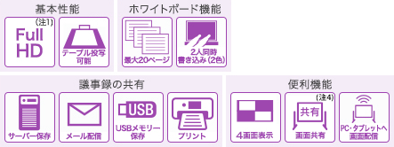 画面上にタイマーを表示できる「タイマー表示機能」や投写画面上で書画カメラを操作できる「書画カメラ連係機能」最大50台のタブレット端末やPCをネットワーク接続・切替ができる「タブレット連携機能」などの便利機能を搭載。