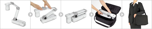 折りたたみが可能な「アーム機構」によってコンパクトな収納が可能です。また、専用のキャリングケースにより、持ち運びにも便利です。