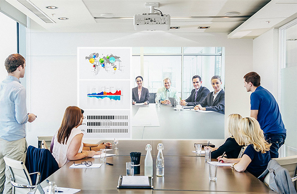 スペースが限られるコワーキングスペースやサテライトオフィスで、密を避けたミーティングや他拠点とのリモート会議を行う場合、プロジェクターなら大画面の投写ができるので、参加者全員が見やすい会議を実現できます。