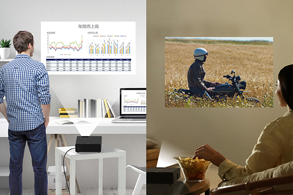 ノートパソコンの小さい画面での在宅ワークは非効率。プロジェクターなら、大画面のサブモニターとして表などが見やすく、Web会議でも相手の表情を見ながら話がしやすくなります。また、より自由な体勢で画面を見ることができるので、快適に過ごせます。さらに、オフタイムにはホームシアターとして利用することができ、おうち時間がより充実したものになります。