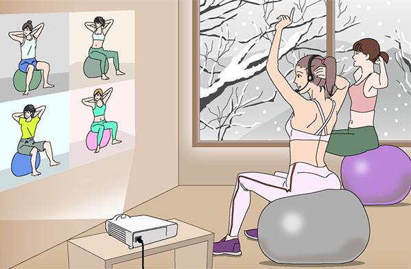 豪雨や積雪など、天候によっては、移動が困難な方もいます。そのため、レッスンやイベントへの参加が難しい場合もあります。このような状況においても滞りなくレッスン等を行うためには、プロジェクターを活用したオンラインでの活動がおすすめです。移動へのハードルをなくし、大画面で投写することにより、オンライン参加者もオフライン参加者も、全員が一体感をもって、活動を行うことができます。