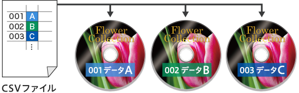 注文データに基づく納品物の作成など、差し込み印刷のように一枚一枚に違うディスクを作成できます。