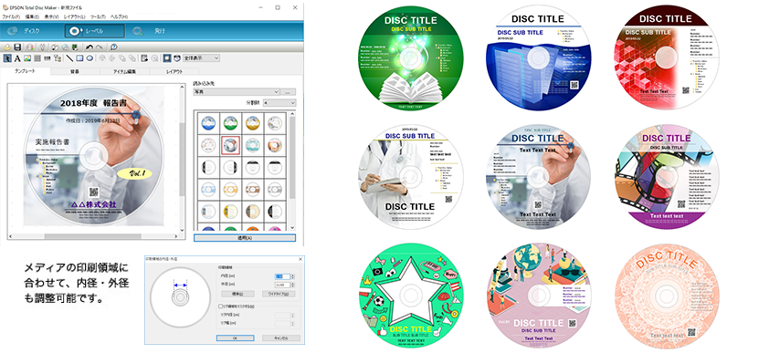 メディアの印刷領域に合わせて、内径・外径も調整可能です。