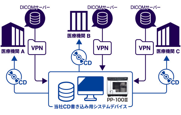 地域医療においては、医師の判断や地域の医療状況に応じて、クリニックと総合病院など医療機関同士で円滑な連携を図り、患者様が継続性のある適切な医療を受けられる「医療連携」を推進しています。医療連携を行う場合、データのやり取りにはプライバシー保護の観点などから、主にメディアとしてCDが活用されます。同社は提携先の医療機関とセキュアなVPNでつながっており、医療機関の保有する患者様の医療データを取り込み、データをCDに書き込むとともに、患者様情報など必要情報をレーベルに印刷しています。作成されたCDは提携先の医療機関に送付され、そこから患者様や連携先の医療機関に渡されることになります。