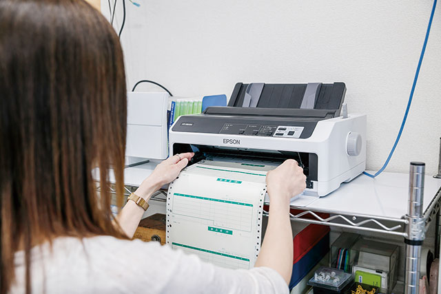 同社では、納品時に使用する複写伝票と各種宅配便の発送伝票の印刷にドットインパクトプリンターを使用しています。現在、お客さまの数はおよそ700社。それぞれに10日、15日、20日、25日、月末と5種の締め日があり、そのタイミングに合わせて複写伝票を印刷。発送伝票とあわせると、月に数百枚の印刷を行っていることになります。