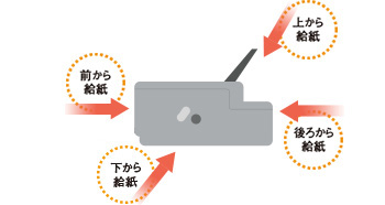 単票紙はトップとフロントから、連続帳票はフロントとリア、ボトムから給紙できる「マルチパスシステム」。