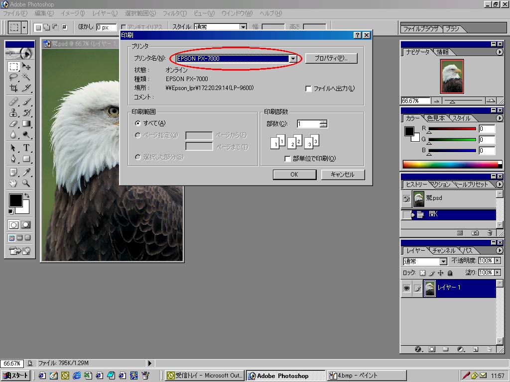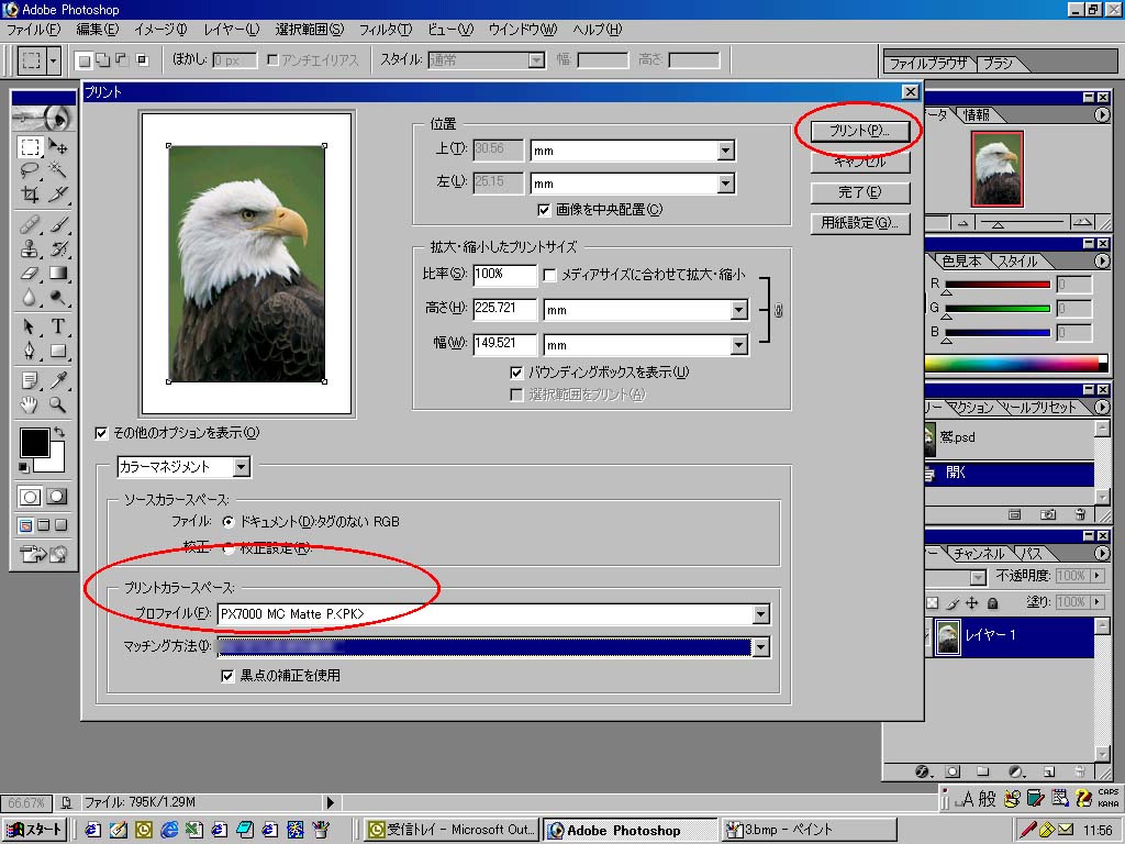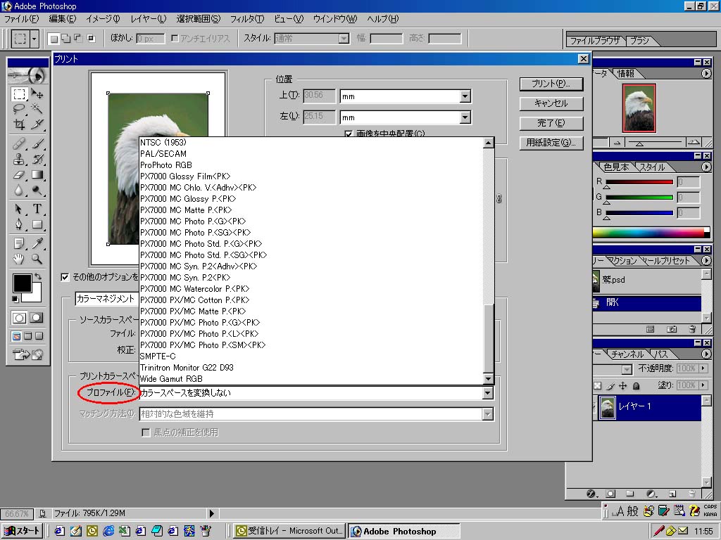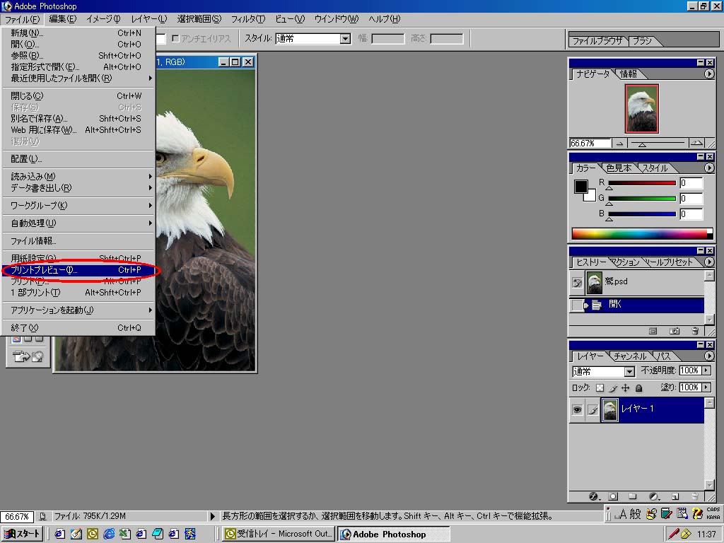 Adobe® PhotoShop® を起動し「ファイル」メニューから「プリントプレビュー」を選択します。