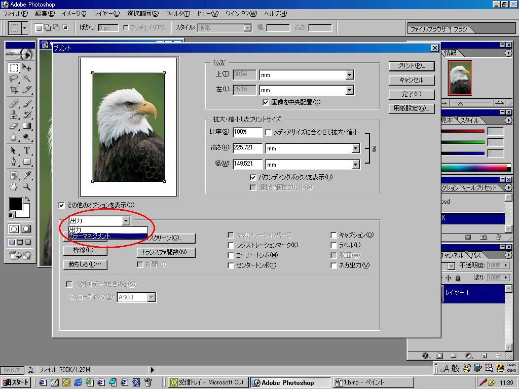 「プリントプレビュー」の左下の項目を「出力」から「カラーマネージメント」に選択します。