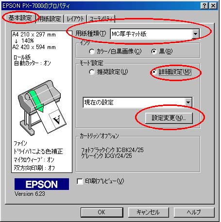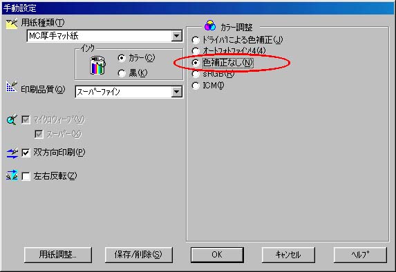 ※「色補正なし」を選択しないとAdobe® Photoshop®とプリンタドライバ両方で色変換され正しい色で印刷できません。