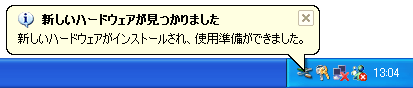 4 | プリンタの電源をオンにし、USB変換ケーブルの小さい方のコネクタを、コンピュータのUSBコネクタに差し込みます。 Windows XPのプラグアンドプレイ動作により、自動的にプリンタドライバがインストールされ、最後に次のような画面が表示されます。 |