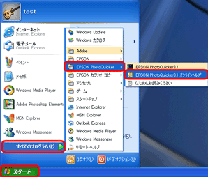 PhotoQuicker3.1オンラインヘルプ』(電子マニュアル)をご覧ください。 オンラインヘルプは以下の方法で表示することができます。 [スタート]メニューをクリックし、 Windows XPでEPSON PhotoQuicker3.1を使用する場合の制限事項や注意点はWindows 2000と同様です。『EPSON PhotoQuicker3.1オンラインヘルプ』(電子マニュアル)のWindows 2000の記載をWindows XPに置き換えてお読みください。ただし、以下の点が異なりますので注意してください。