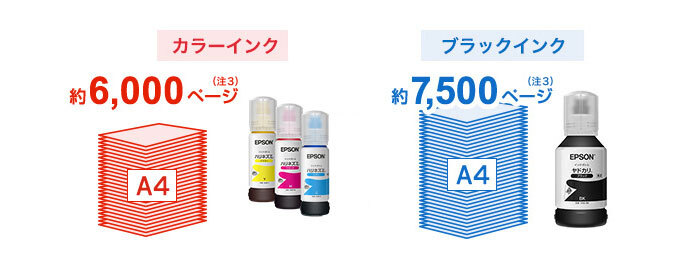 1ページあたりの印刷コストはA4カラー文書で約 1.0円(税込)(注1)、A4モノクロ文書で約 0.4円(税込)(注1)なのでコストを気にせずプリントできます。また、インクボトルの追加購入で1回交換すればA4カラー文書をカラーインクで約6,000ページ・ブラックインクで約7,500ページの大量プリントが可能。