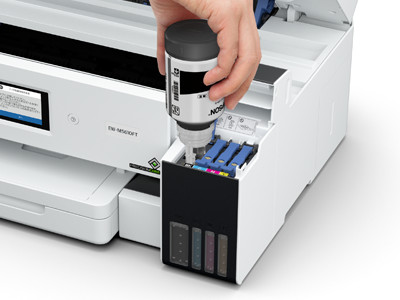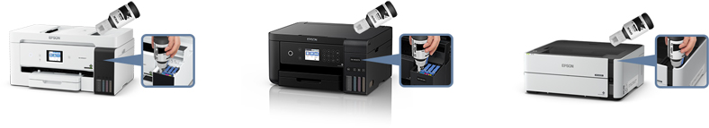 「挿すだけ満タン」インク方式を採用。スクリュー式のキャップを開けて挿すだけで、カンタンにインク補充が開始。満タンになると自動的に補充が完了するので、手も汚れにくく、手間がかかりません。また、タンクとインクボトルの注入口の形状が色ごとに異なるので、入れ間違いも起こりません。