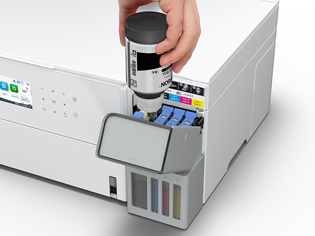 ボトルを挿すだけですぐにインク補充が開始されます。満タンになると自動で止まるので手も汚れにくく、手間もかかりません。さらに、タンクとインクボトルの注入口の形状が色ごとに異なるので、入れ間違いも起こりません。