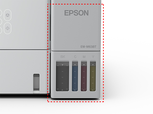 大容量のインクタンクをボディの前面に搭載。タンク部分が独立しているので、スキャナーのフタを上げることなく前面操作で簡単にインク補充ができます。また目盛り付インク窓は撥水性が高く、クリアに見えるのでひと目で正確に残量が確認できます。