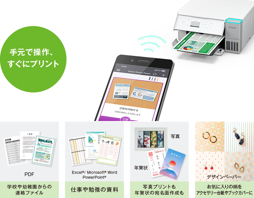 スマホ・タブレット専用アプリ「Epson Smart Panel」を使えば、書類や写真をスマホからカンタン、しかもキレイにプリント。学校や幼稚園からくる連絡ファイルのPDFや在宅で必要になる仕事資料、勉強教材をスマホからすぐプリントできるから便利。