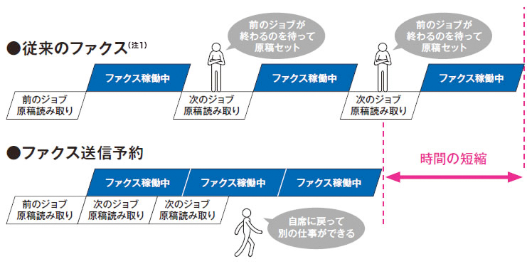コピーやファクスなどの動作中でも、スキャナーを使用していなければ、ファクス送信の予約が可能。動作中のファクスを待つ必要がないので、時間を有効に使えます。
