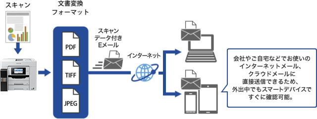 本体でスキャンした原稿を文書ファイルに変換し、Eメールに添付して直接メール送信できます。「スキャンして、ファイルをメールに張り付けて、送信して...」これまでの手間を、スキャン実行ボタン1つで作業完了できます。