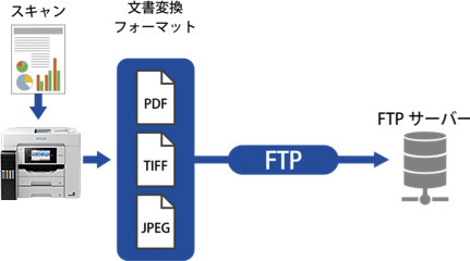 本体でスキャンした原稿をFTPサーバーへ保存することができます。データ容量を気にせずファイル転送が可能になります。