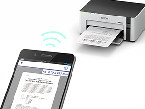 iOS、Android™向けの無料ダウンロードアプリケーション「Epson iPrint」に対応。スマートフォンやタブレット端末などのスマートデバイスから、ネットワーク上(注1)のプリンターに接続して、ドキュメントやWeb、写真などを印刷できます。打ち合わせ中に紙で渡したい資料も、ネットワークに接続されたプリンターがあれば、そこから出力。印刷のために席を立つ必要はありません。