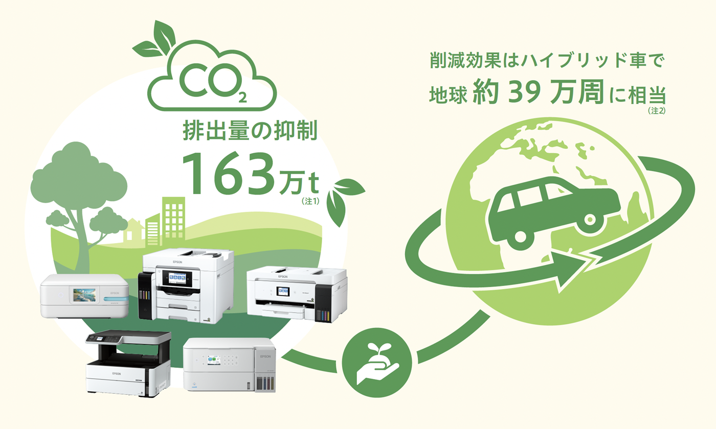 エコタンク方式では従来のカートリッジ方式と比較して累計163万トンのCO₂排出量の抑制に貢献しました。