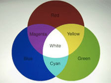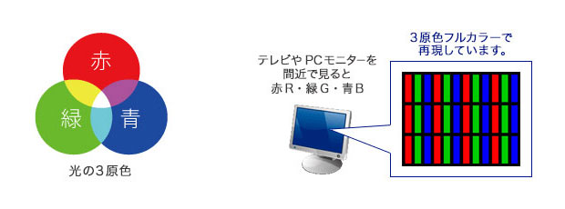 光の3原色とは、赤(R)緑(G)青(B)の3色のことで、3LCDプロジェクターは、他のモニターやデジタルカメラ、スキャナーなどの、光で色を表現する機器と同じく、これらの3色を混合することでフルカラーを再現しています。