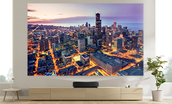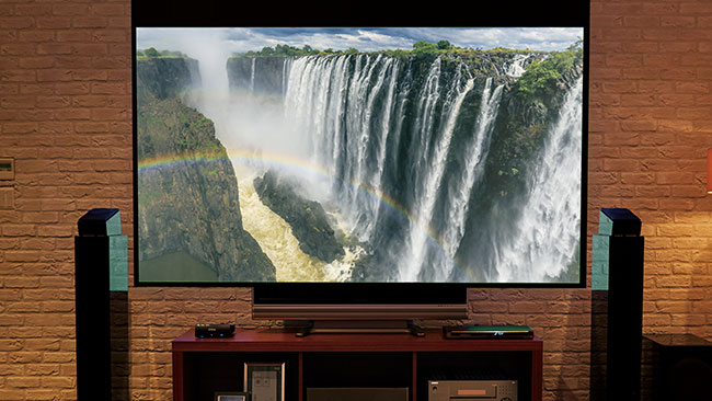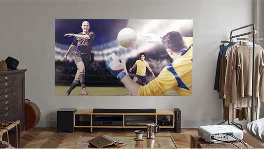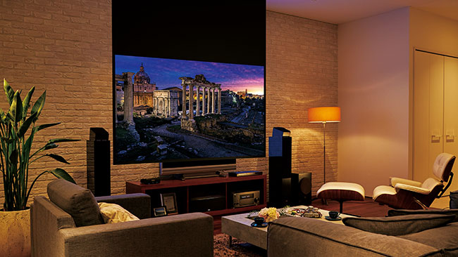 ホームシアターで映画館気分を味わうなら、やはり100インチ以上がお勧め。プロジェクターなら、100インチは当たり前で、投写距離を長く取れば120インチや140インチも可能。プロジェクターのメリットは、テレビよりもコンパクトで、狭い部屋でも気軽に導入できるところです。