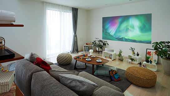 インテリアを重視し、さらにプロジェクターを常設ではなく、使いたい時だけ設置することも可能です。プロジェクターはテレビと比べて本体が小型軽量だからこそ実現できるメリットと言えます。普段のインテリアや家具の配置を優先するとプロジェクターを設置できる場所が限定されがちですが、これも心配いりません。エプソンのプロジェクターは、斜め横から投写して映像が台形に変形しても、補正が可能です。
