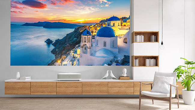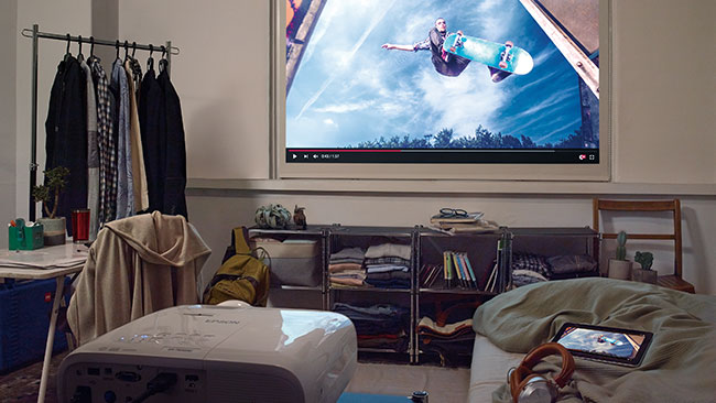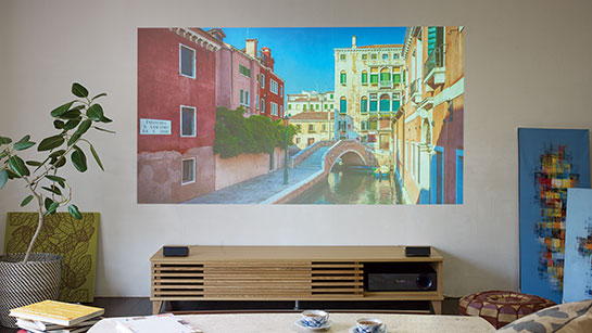 エプソンの超短焦点プロジェクター「EH-LS670」は、テレビと同じくボードの上に置いておくだけで壁に大画面を投写できるのが大きな魅力。使っていないときも、テレビほど存在感がなくインテリアを邪魔しません