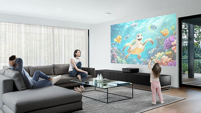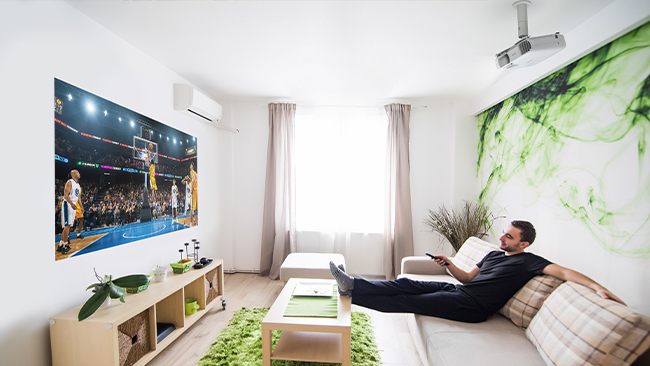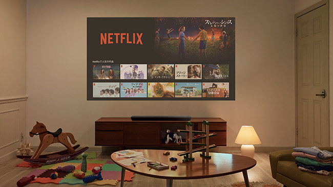 余談ですが、プロジェクターで壁面に投写すると、テレビよりも視聴距離を長く取れるので、映像の圧迫感も少なく、同じ空間でより大画面を楽しめるのも利点です。