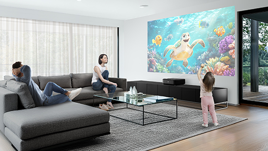 その最たる例が、新しい「超短焦点プロジェクター」の活用。製品にもよりますが、壁の手前に置くだけで、80型~100型もの大画面を実現できることから、注目を集めています。