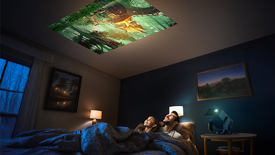製品にもよりますが、「モバイルプロジェクター」は、映像を映すプロジェクターとしての機能の他にも、バッテリーを内蔵しておりコンセントが不要で、さらにWi-Fi® 機能や、YouTube™/Netflixといった各種ネット配信サービスの再生にも対応しています。加えて、スピーカーも内蔵。つまり、ホームシアターに必要な全てが小さなボディに凝縮されていて、“完全ワイヤレス”で映像と音を楽しむことができるのです。また、ボディが小型軽量なので、好きな場所に持ち運び、映像を壁や天井に映し出すのも楽々。こうした手軽さが受けて、注目を集めています。