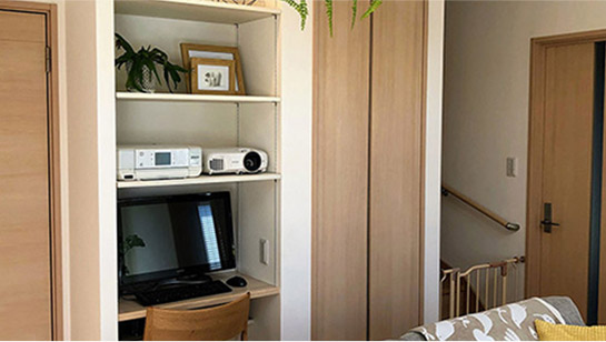 住宅の工事を避けたい場合は、オーダー家具という手があります。戸棚にプロジェクター専用の収納スペースを設け、使用するときだけ扉を開くイメージです。