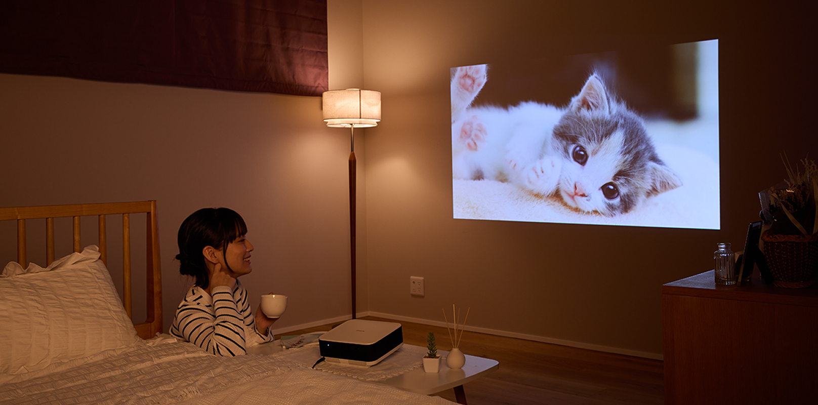 あなただけの時間・空間を、もっと贅沢に。映画やドラマ、アニメはもちろん、音楽ライブの映像やゲームのプレイ画面まで、まるでその場にいるような臨場感あふれる大画面のある空間が手に入ります。リモートワークや家事をしながらの「ながら見」にもちょうどよく、ソファでくつろぎながら、ベッドに横になりながらと、どんなスタイルにもフィット。ひとり暮らしのお部屋にしっくりなじみ、空間をセンス良く彩ってくれる存在です。