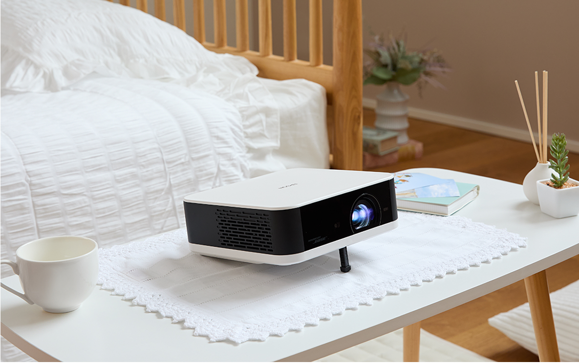 壁に向けてスイッチを押す。それだけでプロジェクターが、壁掛け時計やカレンダーなど壁の障害物を避けて画面を投写。投写位置の微調整をする手間がないから、すぐに大画面が楽しめます。