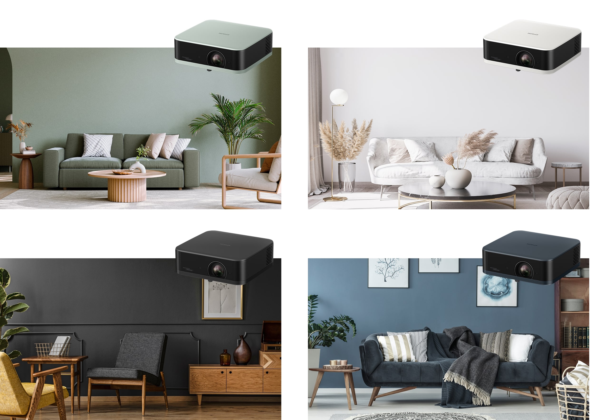 こだわりのインテリアを邪魔しないスタイリッシュなデザイン。お部屋の中にポンと置いてもなじみます。一番目に入る天面に操作ボタンは配置せず、「インテリアの一部になるプロジェクター」を目指しました。