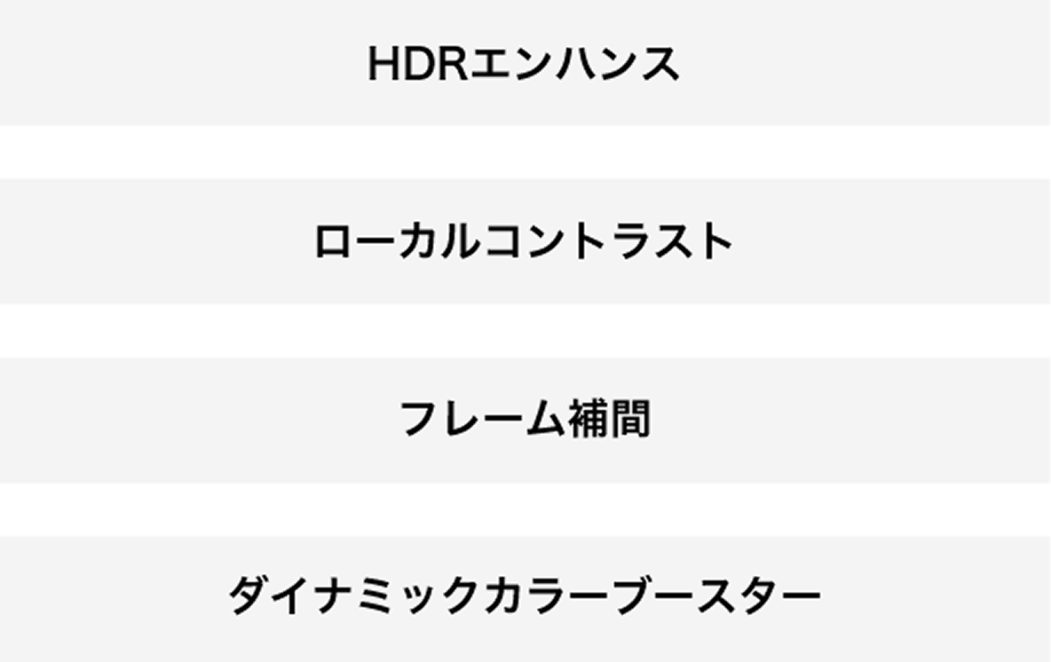 HDRエンハンス、ローカルコントラスト、フレーム補間、ダイナミックカラーブースターなどの映像補正機能を搭載。細部まで鮮やかで、なめらかな映像体験を楽しめます。