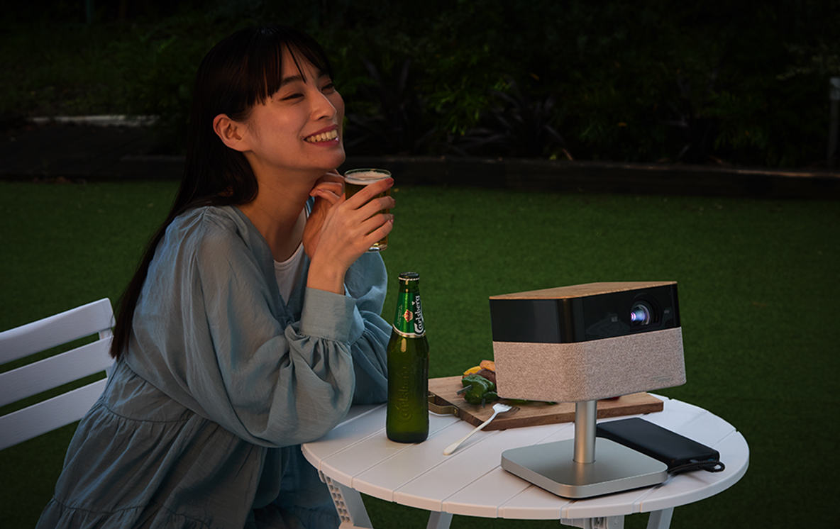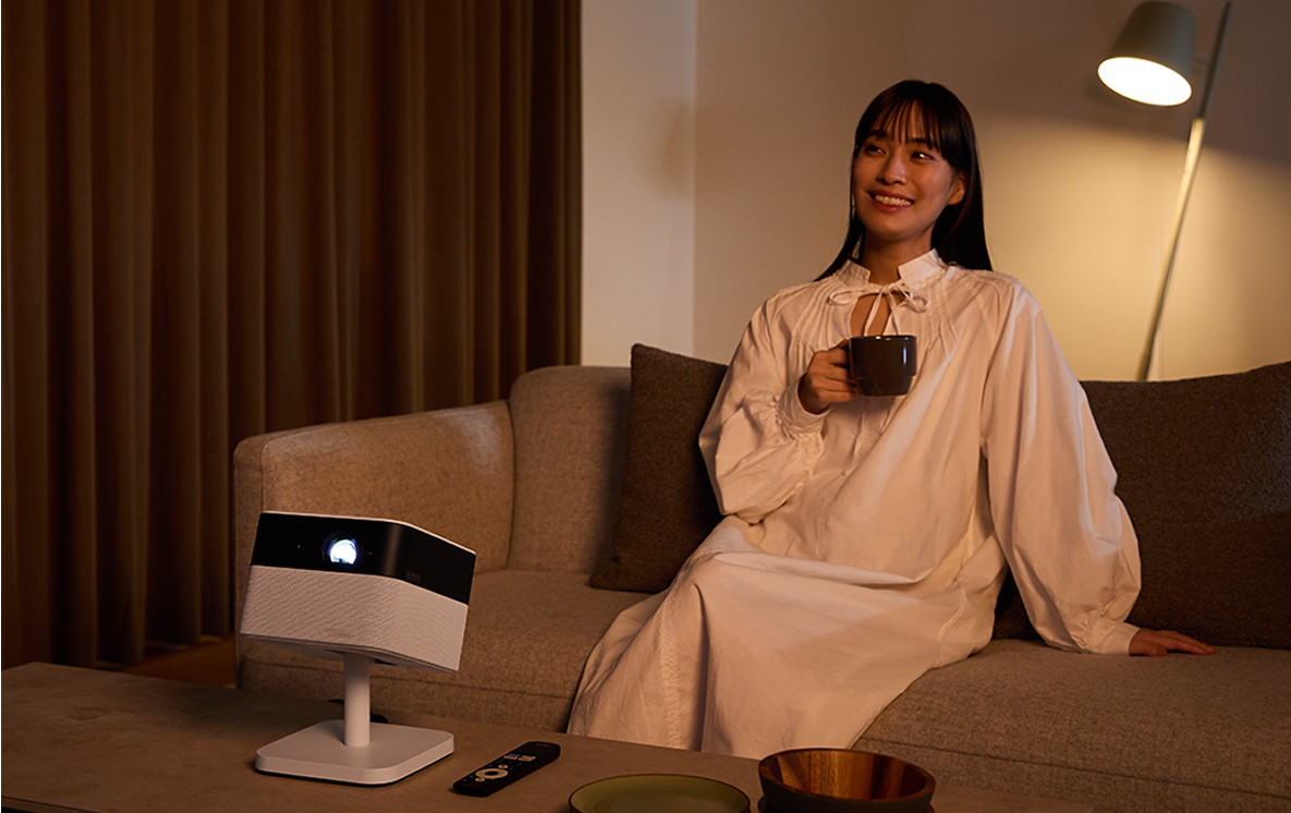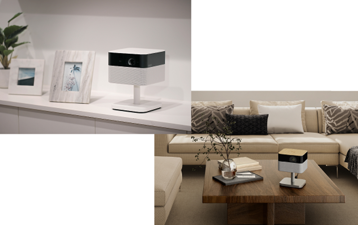 どんなインテリアにも合う白と、インテリアの主役になれるオークの2色をご用意。こだわりのお部屋に馴染み、空間全体の雰囲気を一層引き立てる家庭用プロジェクターです。