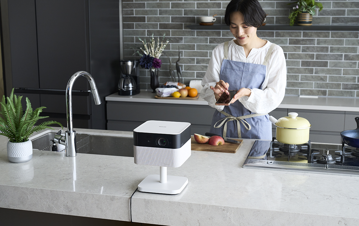 壁に向けてスイッチを押す。それだけでプロジェクターが、壁掛け時計やカレンダーなど壁の障害物を避けて画面を投写。投写位置の微調整をする手間がないから、すぐに大画面が楽しめます。
