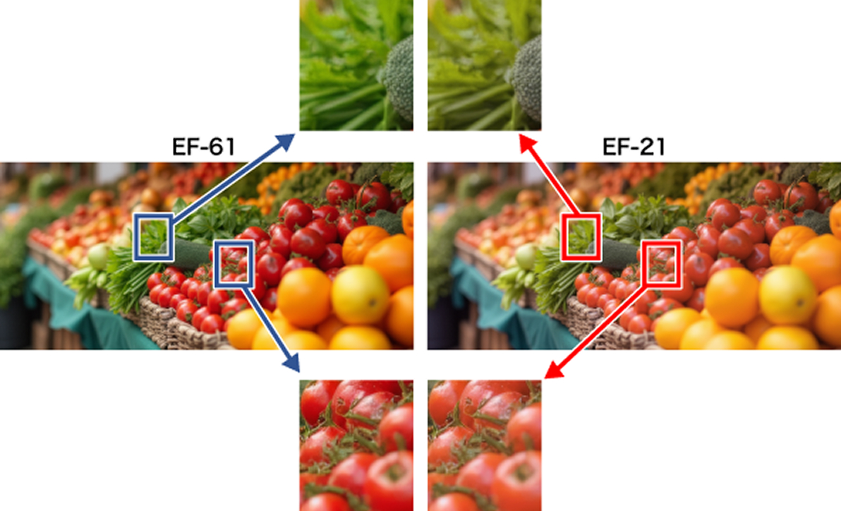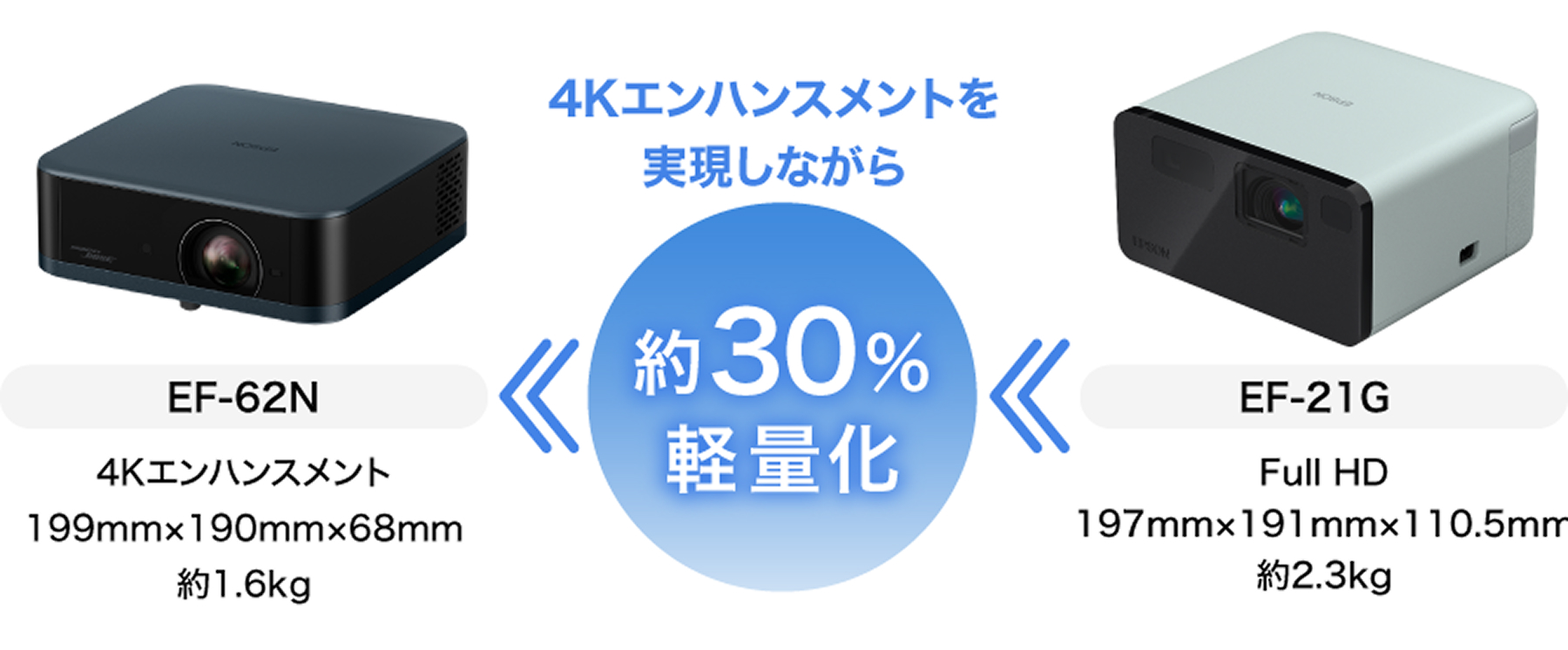 これにより、従来機と同レベルの筐体サイズで4Kエンハンスメントを実現しながら、約30%軽量化しました(EF-62とEF-21の比較)。