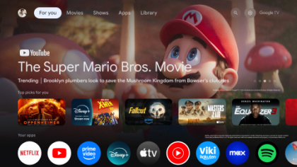 Google TV™ が搭載されているので、これ一台で動画配信サービスを大画面で楽しめます。Netflix、YouTube™、Apple TV、Amazon Prime Video、Disney+など、さまざまな動画配信サービスに対応。気分に合わせて選べます。